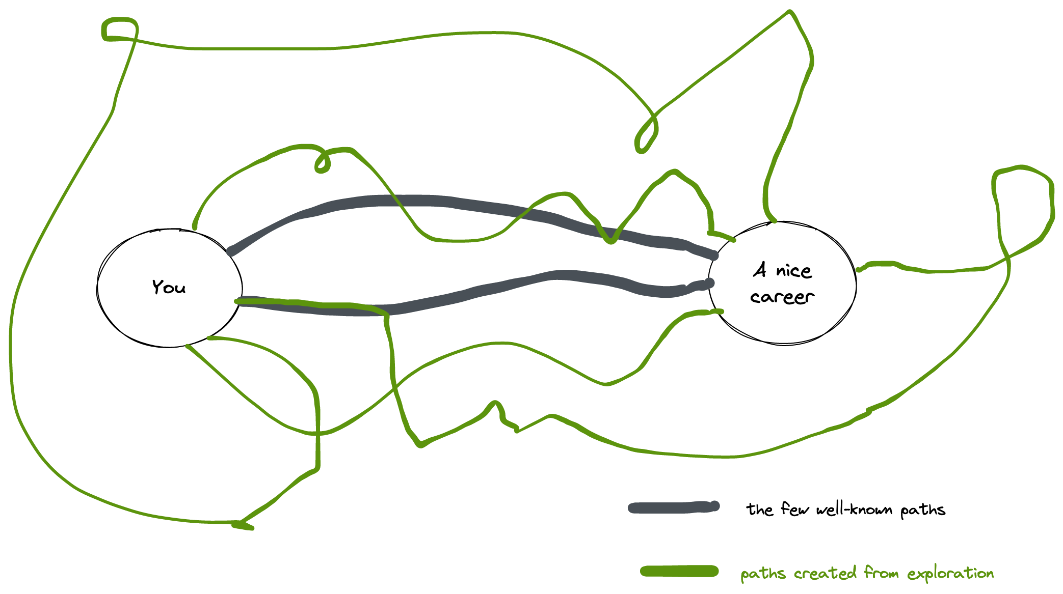 Well, here’s my hypothesis—it actually makes it worse for your career, because you are eliminating those serendipitous moments that take your career in an interesting direction. You are instead opting for “set menus” that have known outcomes which are heavily marketed. Get good grades, get a degree, crack the interviews, get a great job. That’s usually the overarching theme, and the dominating concept of what a life is.